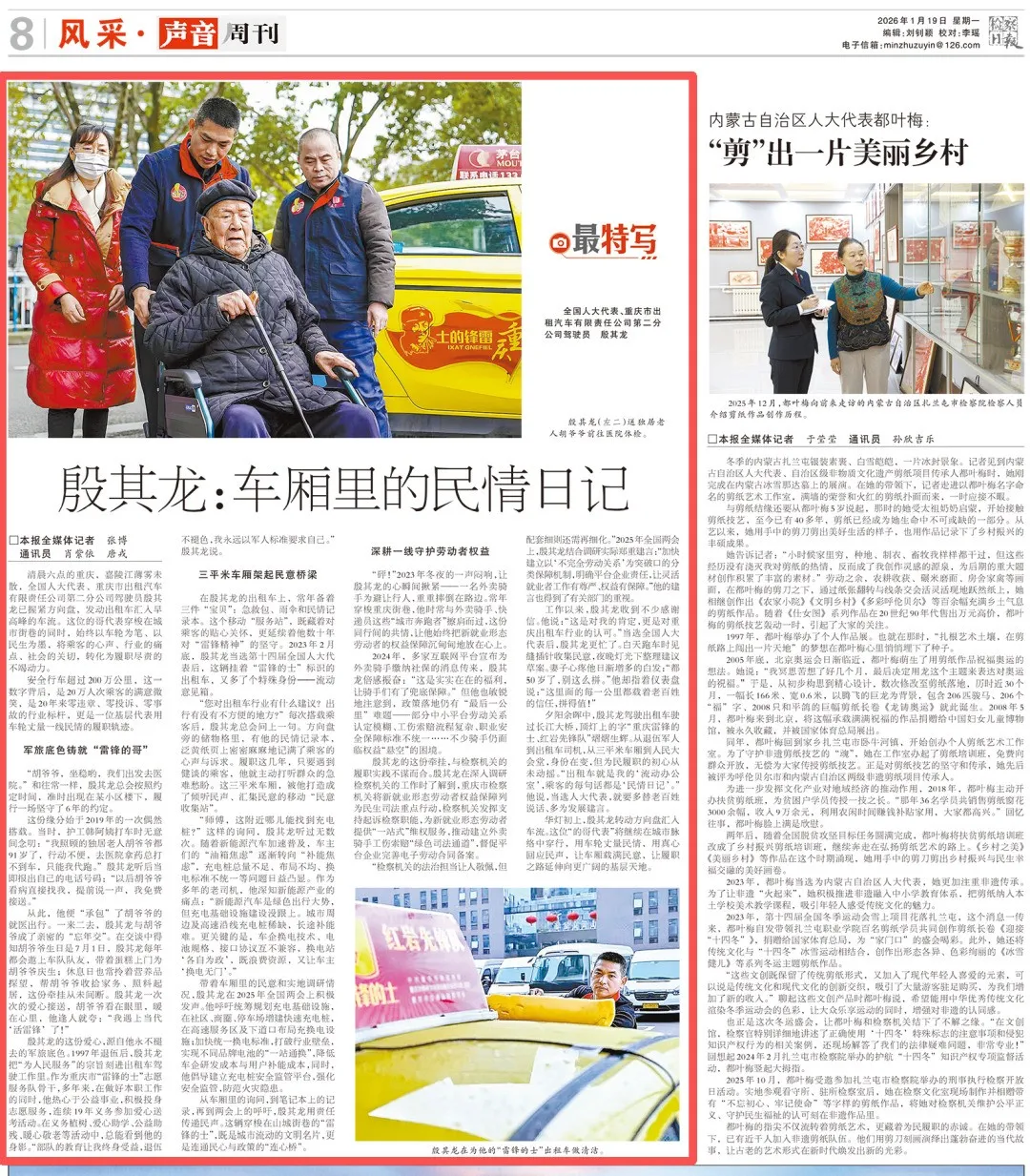从车厢里的询问,到笔记本上的记录,再到两会上的呼吁,殷其龙用责任传递民声。这辆穿梭在山城街巷的“雷锋的士”,既是城市流动的文明名片,更是连通民心与政策的“连心桥”。