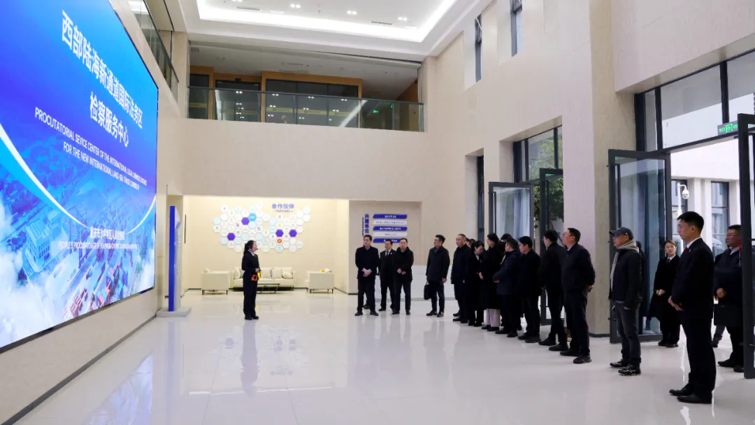 2025年12月23日至24日,重庆市沙坪坝区检察院组织开展“服务保障市场化、法治化、国际化一流营商环境建设”代表视察活动。图为全国人大代表、市人大代表参观西部陆海新通道国际法务区检察服务中心。