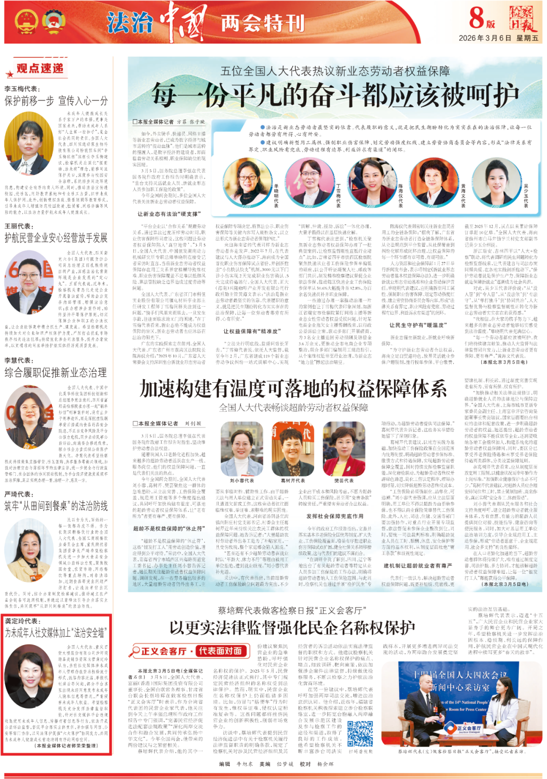 2026年3月6日,《检察日报》第8版“法治中国·两会特刊”专栏刊登《龚定玲代表:为未成年人社交媒体加上“法治安全墙”》一文,内容如下: