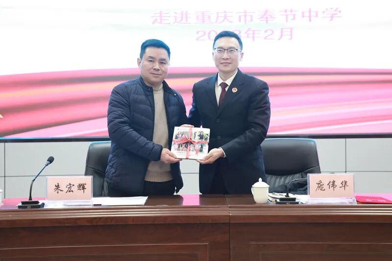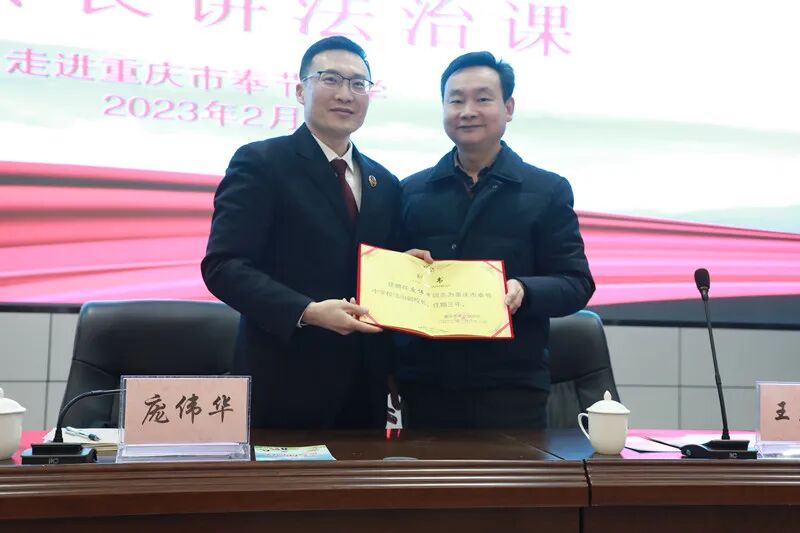 活动中,奉节中学向庞伟华检察长颁发了“法治副校长”聘任证书。庞检也代表县检察院,向奉节中学赠送《莎姐讲故事》普法漫画书100册。