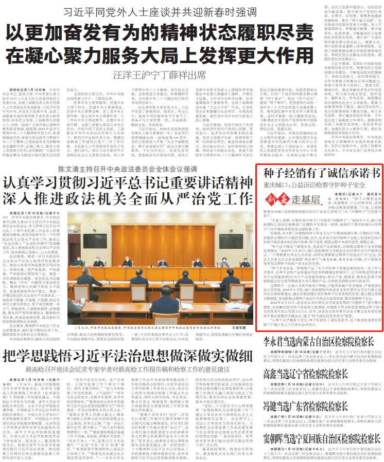 2023年1月17日,《检察日报》头版“新春走基层”专栏刊登《种子经销有了诚信承诺书——重庆城口:公益诉讼检察守护种子安全》一文,内容如下: