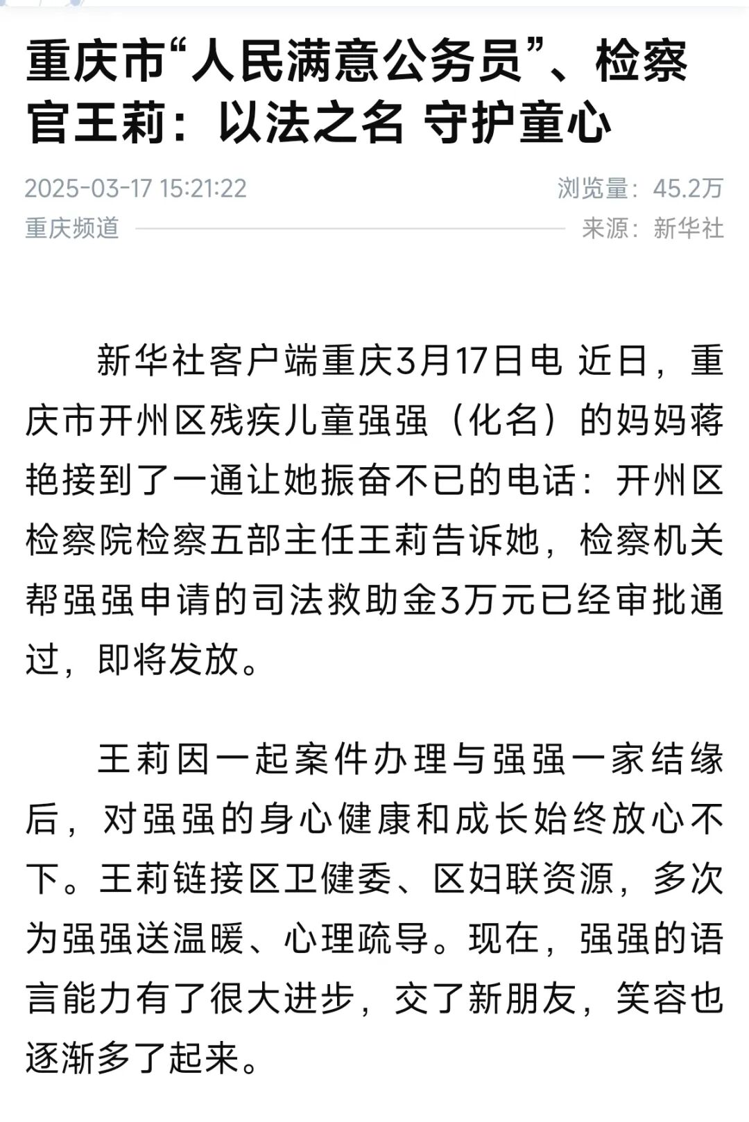 2025年3月17日,新华社重庆频道刊登《重庆市“人民满意公务员”、检察官王莉:以法之名 守护童心》一文,内容如下(点击文末“阅读原文”可查看完整内容):