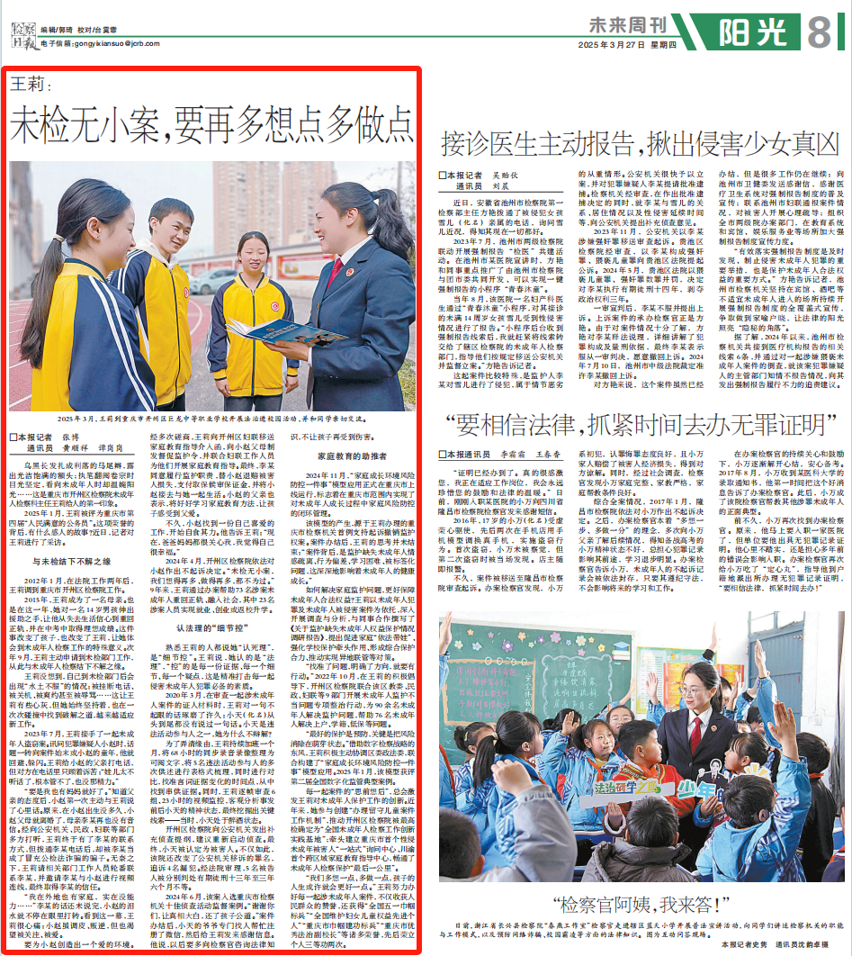 2025年3月27日,《检察日报》第8版刊登《王莉:未检无小案,要再多想点多做点》一文,内容如下: