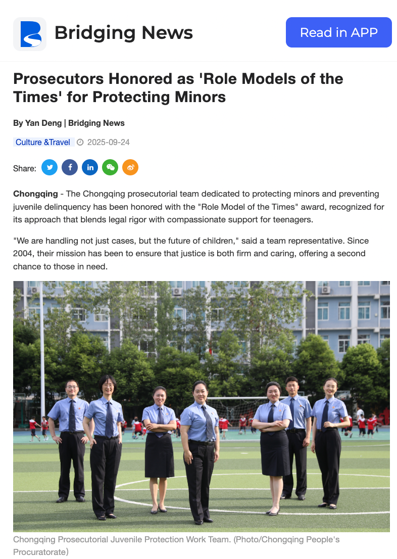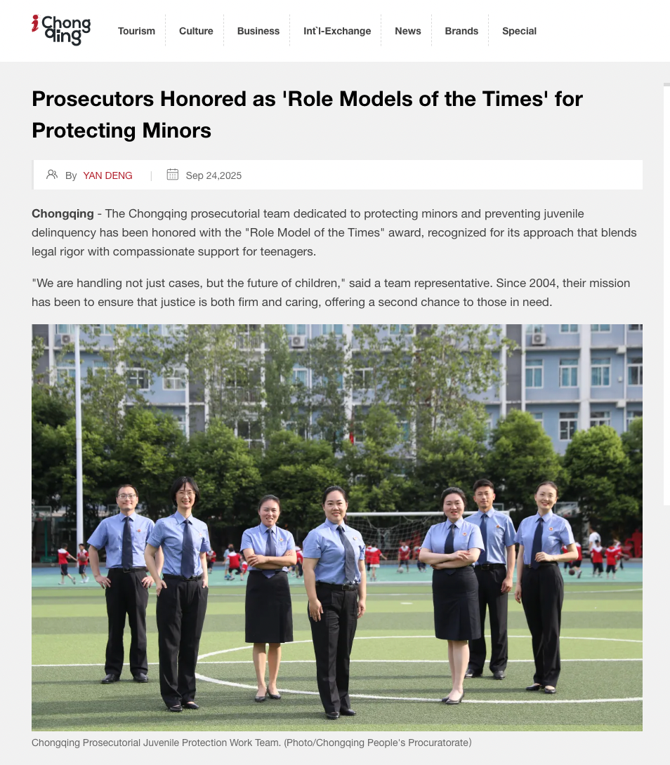 近日,中央宣传部授予重庆检察未成年人保护工作团队代表“时代楷模”称号,Bridging News、iChongqing等媒体持续高度关注渝检护“未”