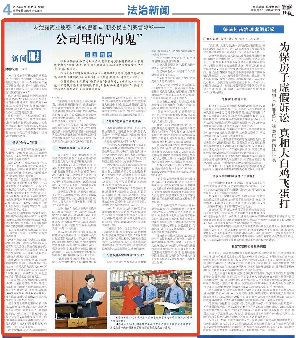 2024年12月2日,《检察日报》第4版刊登《从泄露商业秘密、“蚂蚁搬家式”职务侵占到兜售隐私——公司里的“内鬼”》一文,其中对梁平区检察院依法惩治民营企业内部腐败犯罪的经验做法进行报道,内容如下: