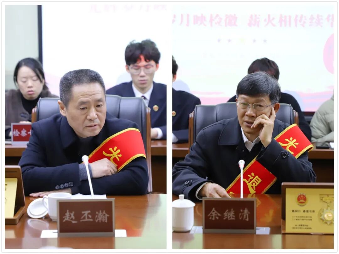 我院党组书记、检察长汤茜茜参加活动并讲话。2025年退休干警赵丕瀚、余继清,在家院领导、各部室负责人、干警代表参加座谈活动。