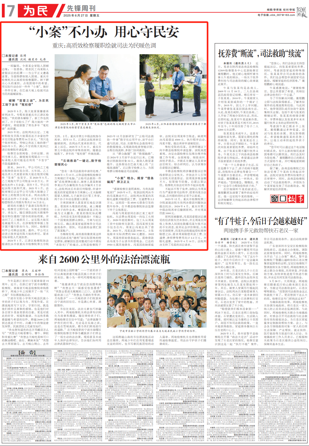 2025年6月27日,《检察日报》第7版刊登《“小案”不小办 用心守民安——重庆:高质效检察履职绘就司法为民暖色调》一文,内容如下: