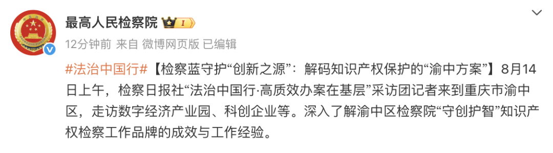 8月14日上午,检察日报社“法治中国行·高质效办案在基层”重庆行记者来到重庆市渝中区,走访数字经济产业园、科创企业等,深入了解渝中区检察院“守创护智”知识产权检察工作品牌的成效与工作经验。