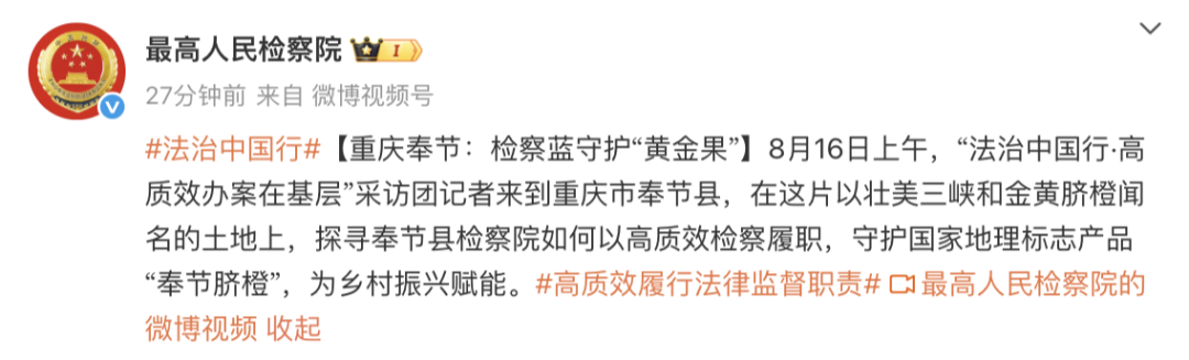 8月16日,“法治中国行·高质效办案在基层”重庆行记者一行来到重庆市奉节县,在这片以壮美三峡和金黄脐橙闻名的土地上,探寻奉节县检察院如何以高质效检察履职,守护国家地理标志产品“奉节脐橙”,赋能乡村振兴。