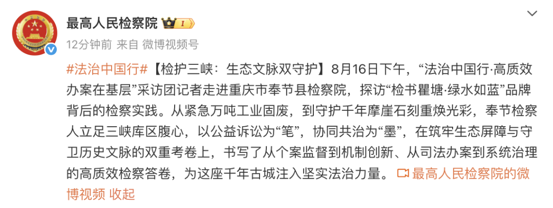 奉节县检察院如何守护“一江碧水、两岸青山、千年文脉”?法治中国行·高质效办案在基层”采访团记者走进重庆市奉节县检察院,探访“检书瞿塘·绿水如蓝”品牌背后的检察实践。从紧急清运威胁长江支流的万吨工业固废,到助力千年摩崖石刻重焕光彩,奉节检察人以公益诉讼为“笔”,以协同共治为“墨”,在筑牢生态屏障与守卫历史文脉的双重考卷上,书写了从个案监督到创新机制、从司法办案到系统治理的“高质效”检察答卷,为这座千年古城注入坚实的法治力量。