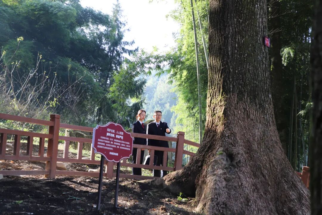 如今,山坡上的两棵桢楠已摆脱“病弱”状态——树上新设的保护牌在阳光下格外醒目,整齐的防护围栏静静守护着树根,曾经裸露的土壤已被专业保护带覆盖,枯枝修剪后的切口愈合泛青,疤痕边缘,竟钻出了星星点点的绿意,重新焕发出蓬勃生机。