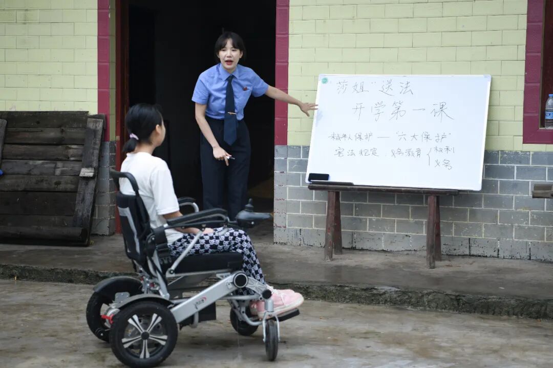 有一张照片始终让我动容:2021年夏天,在略显简陋的庭院中,一位“莎姐”检察官俯身在残疾少女小佳身边,手捧课本轻声讲解,午后的阳光洒向摊开的书页,也映亮了小佳眼中闪烁的求知光芒。