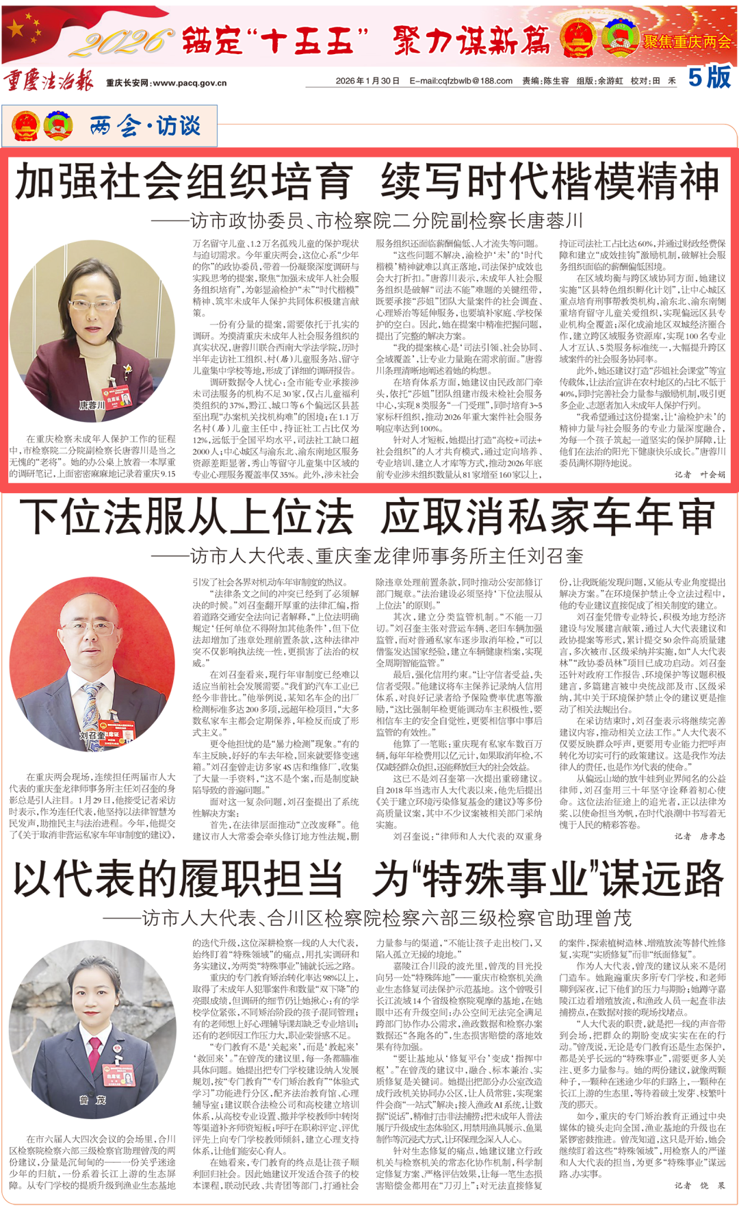 “我希望通过这份提案,让‘渝检护未’的精神力量与社会服务的专业力量深度融合,为每一个孩子筑起一道坚实的保护屏障,让他们在法治的阳光下健康快乐成长。”唐蓉川委员满怀期待地说。