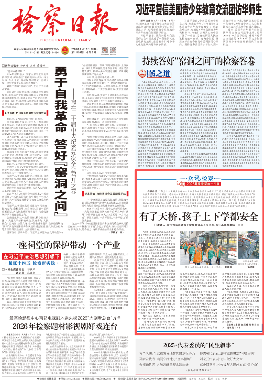 2026年1月12日,《检察日报》头版“众说检察·2025印象最深的一件事”专栏刊登《有了天桥,孩子上下学都安全》一文,内容如下: