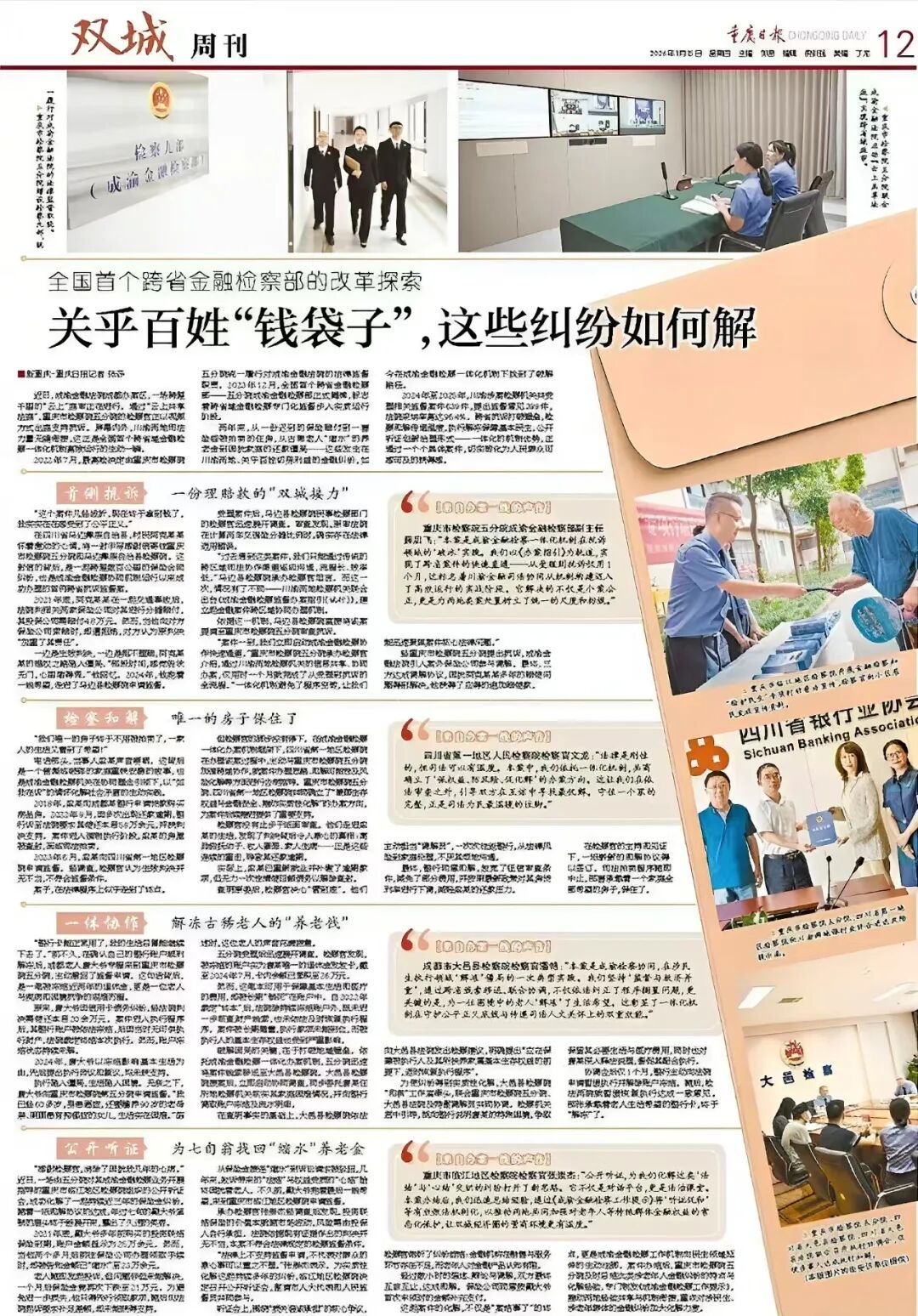 2026年1月15日,《重庆日报》第12版整版刊登《全国首个跨省金融检察部的改革探索——关乎百姓“钱袋子”,这些纠纷如何解》一文,内容如下: