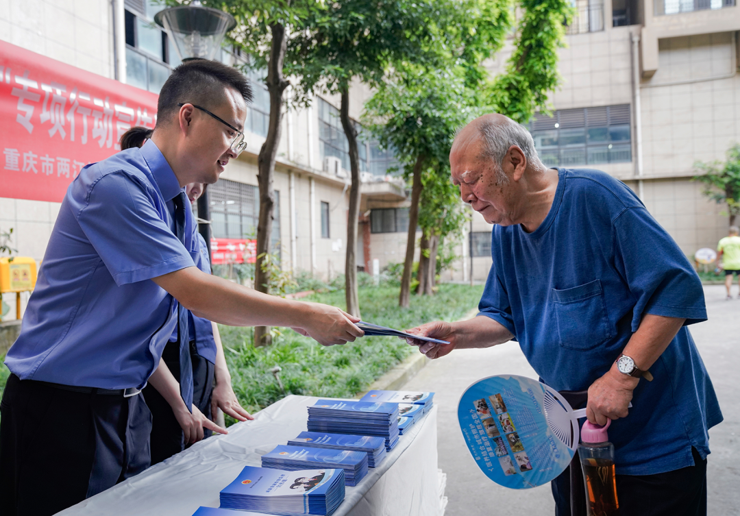 重庆市临江地区检察院开展金融检察和“检护民生”专项行动普法宣传,检察官向小区居民发放宣传资料。
