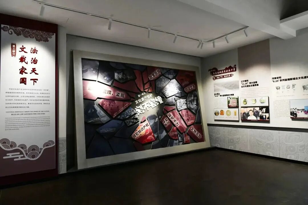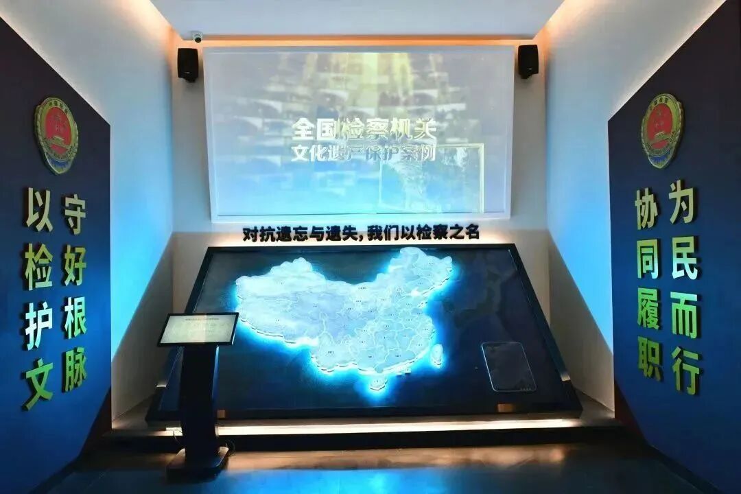 该厅主要以艺术卷轴融合多媒体投屏的形式,通过意向式影片概括演绎了文化遗产保护法治化的建设进程。名为“守护”的艺术雕塑,生动阐释了检察机关以“心之洞明”和“法之正义”护好历史文化遗产的理念。