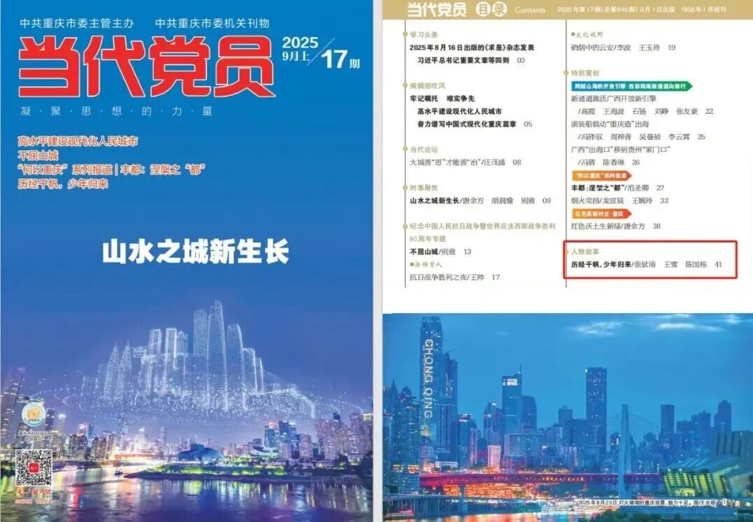 《当代党员》2025年第17期刊登了《历经千帆,少年归来——重庆检察未成年人保护工作团队代表二十一载护“未”之路》一文,对重庆检察未成年人保护工作团队中涌现出来的优秀代表梅玫、龚珊、唐焕然、吴波、李非白、孙文静、王莉等7位检察官的护“未”事迹作了专题报道,展现了重庆市检察机关在党委领导下,忠实践行习近平法治思想,坚持宽严相济、惩防并举,推进综合履职、积极预防,推动“六大保护”协同发力,守护未成年人健康成长的生动实践。内容如下: