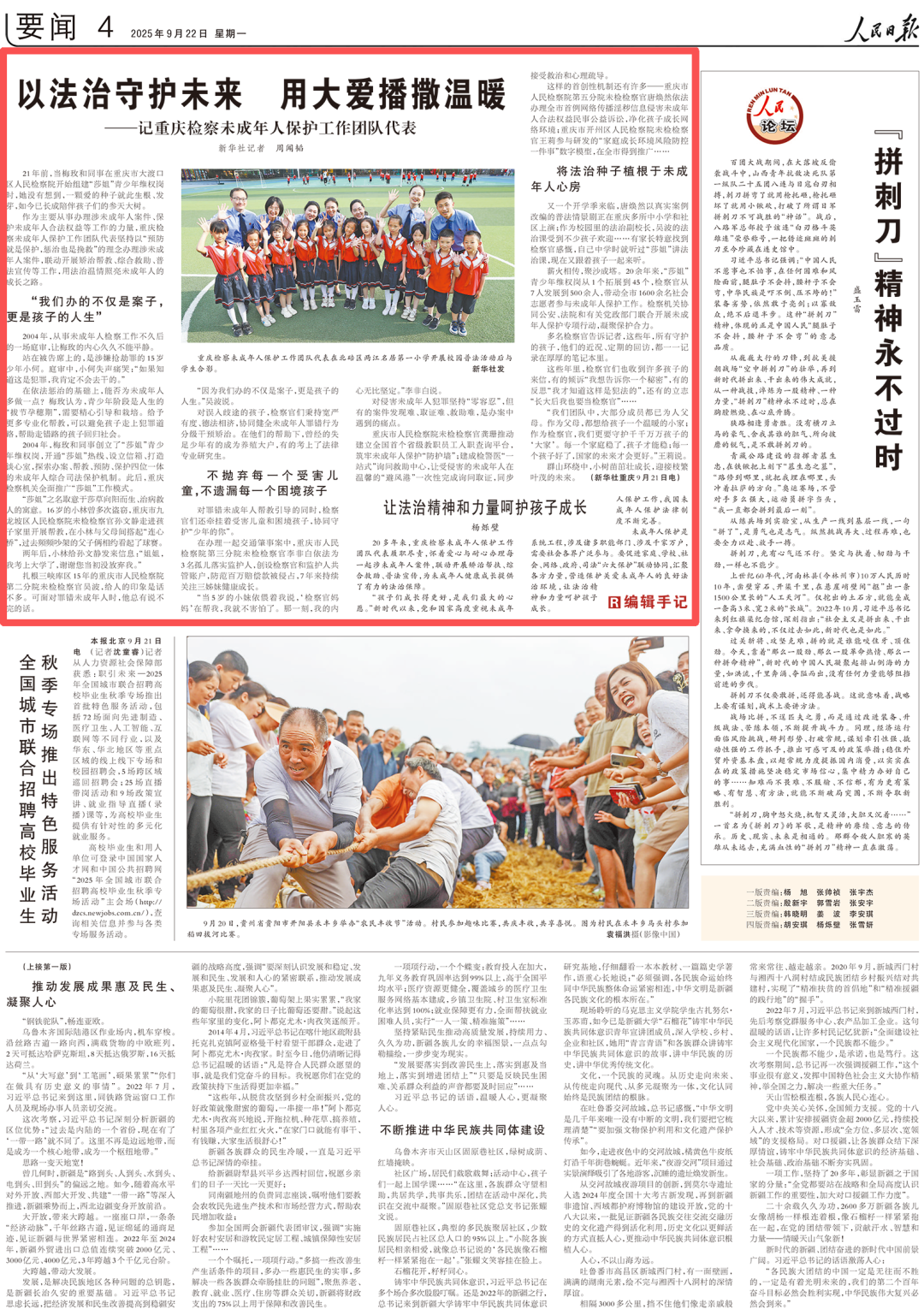 2025年9月22日,《人民日报》第4版刊登《以法治守护未来 用大爱播撒温暖——记重庆检察未成年人保护工作团队代表》一文,内容如下: