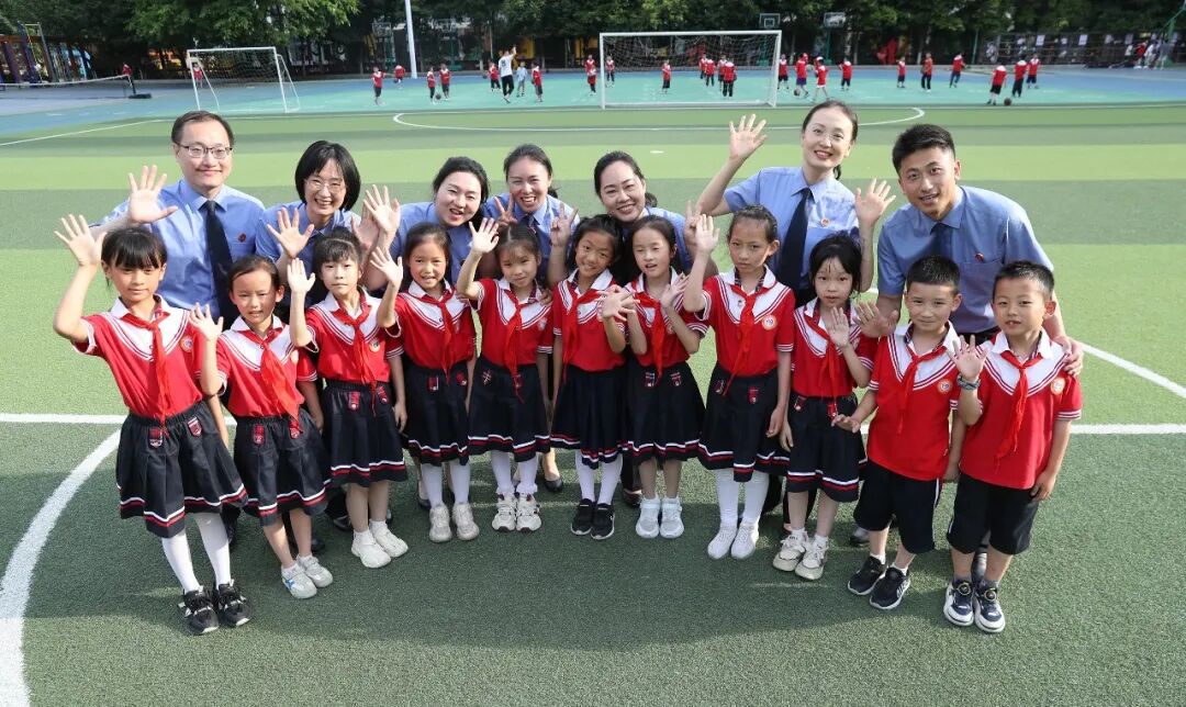 重庆检察未成年人保护工作团队代表在北碚区两江名居第一小学开展校园普法活动后与学生合影。
