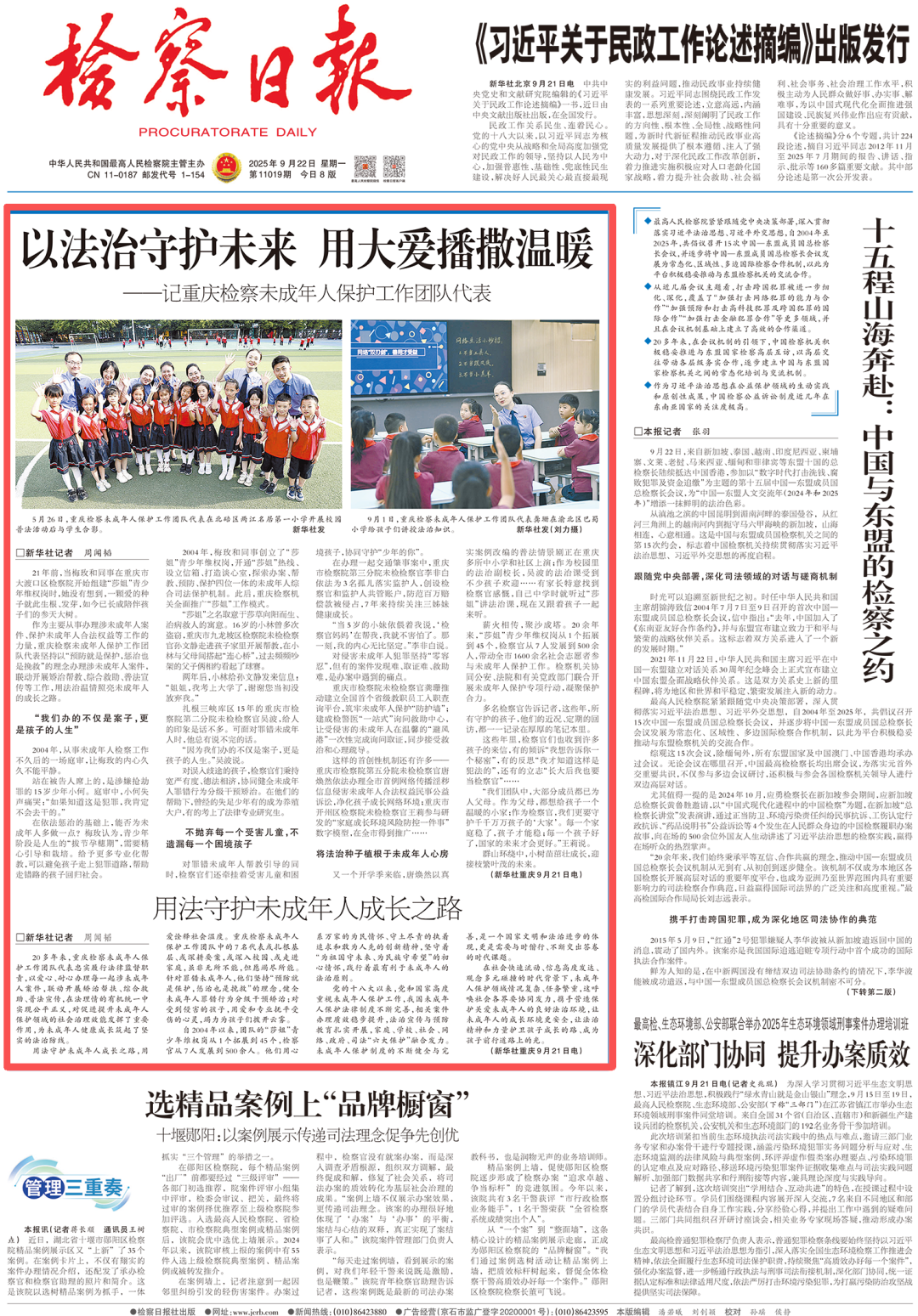 2025年9月22日,《检察日报》头版头条刊登《以法治守护未来 用大爱播撒温暖——记重庆检察未成年人保护工作团队代表》一文,内容如下: