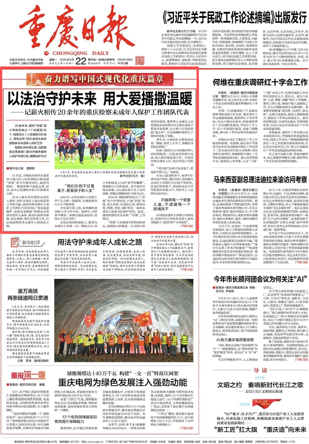 2025年9月22日,《重庆日报》头版头条转第2版刊登《以法治守护未来 用大爱播撒温暖——记薪火相传20余年的重庆检察未成年人保护工作团队代表》一文,内容如下: