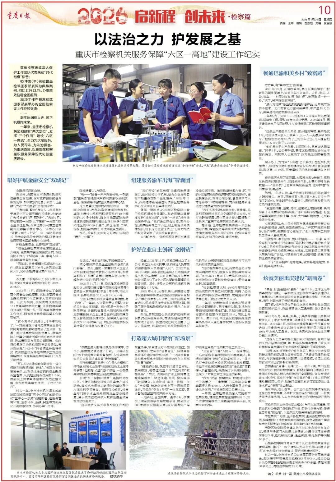 2026年1月29日,《重庆日报》第10版整版刊登《以法治之力 护发展之基——重庆市检察机关服务保障“六区一高地”建设工作纪实》一文,内容如下:
