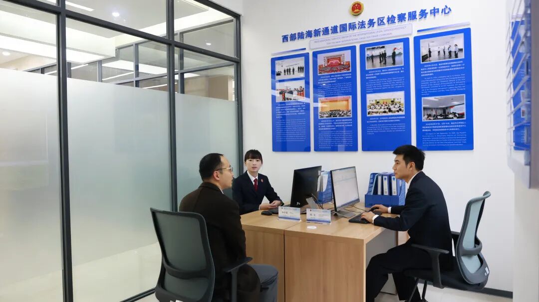 重庆市检察机关在重庆国际物流枢纽园区探索设立了西部陆海新通道国际法务区检察服务中心。图为沙坪坝区检察院检察官为园区企业提供法律咨询服务。