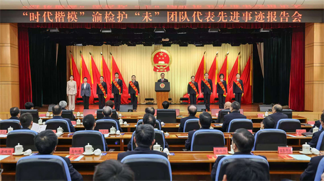 渝检护“未”团队主要从事办理涉未成年人案件、保护未成年人合法权益等工作。今年8月,中央宣传部授予渝检护“未”团队代表“时代楷模”称号,在全社会引发强烈反响。中央政法委和最高检先后印发学习渝检护“未”团队代表先进事迹的通知和决定。报告会上,梅玫、吴波、李非白、唐焕然、孙文静、王莉、龚珊、韩丹、刘亚等9名报告团成员,结合自身经历,通过一个个案例故事、一幕幕情境再现,从不同角度深情讲述了渝检护“未”团队代表深入践行习近平法治思想,德法相伴、倾情守护未成年人健康成长的先进事迹和感人故事。朴实真挚的讲述引发全场强烈共鸣,阵阵掌声响彻会场。