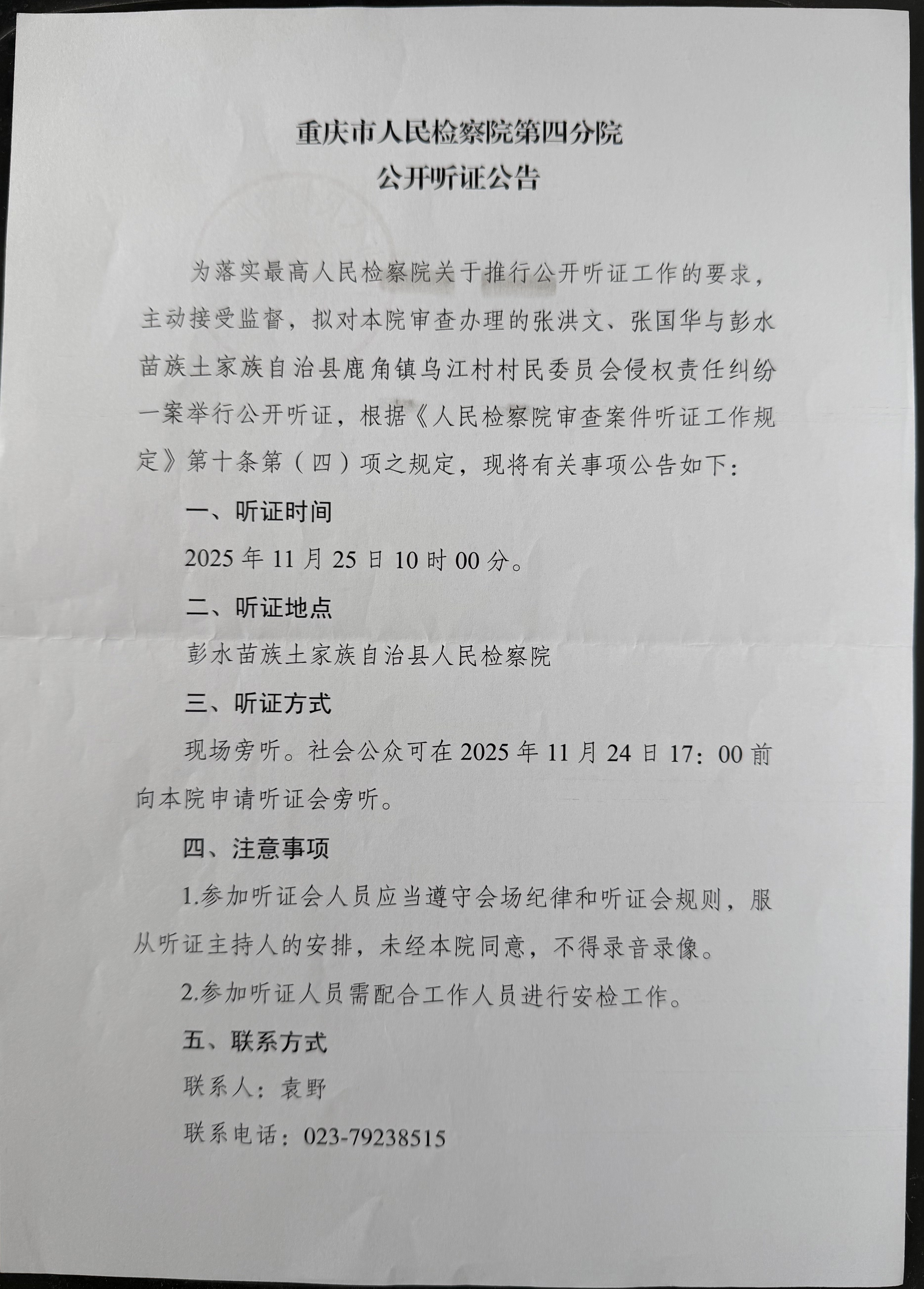 由本院审查办理的张洪文、张国华与彭水县鹿角镇乌江村村民委员会侵权责任纠纷一案,定于2025年11月25日10:00在重庆市彭水县人民检察院举行公开听证会。