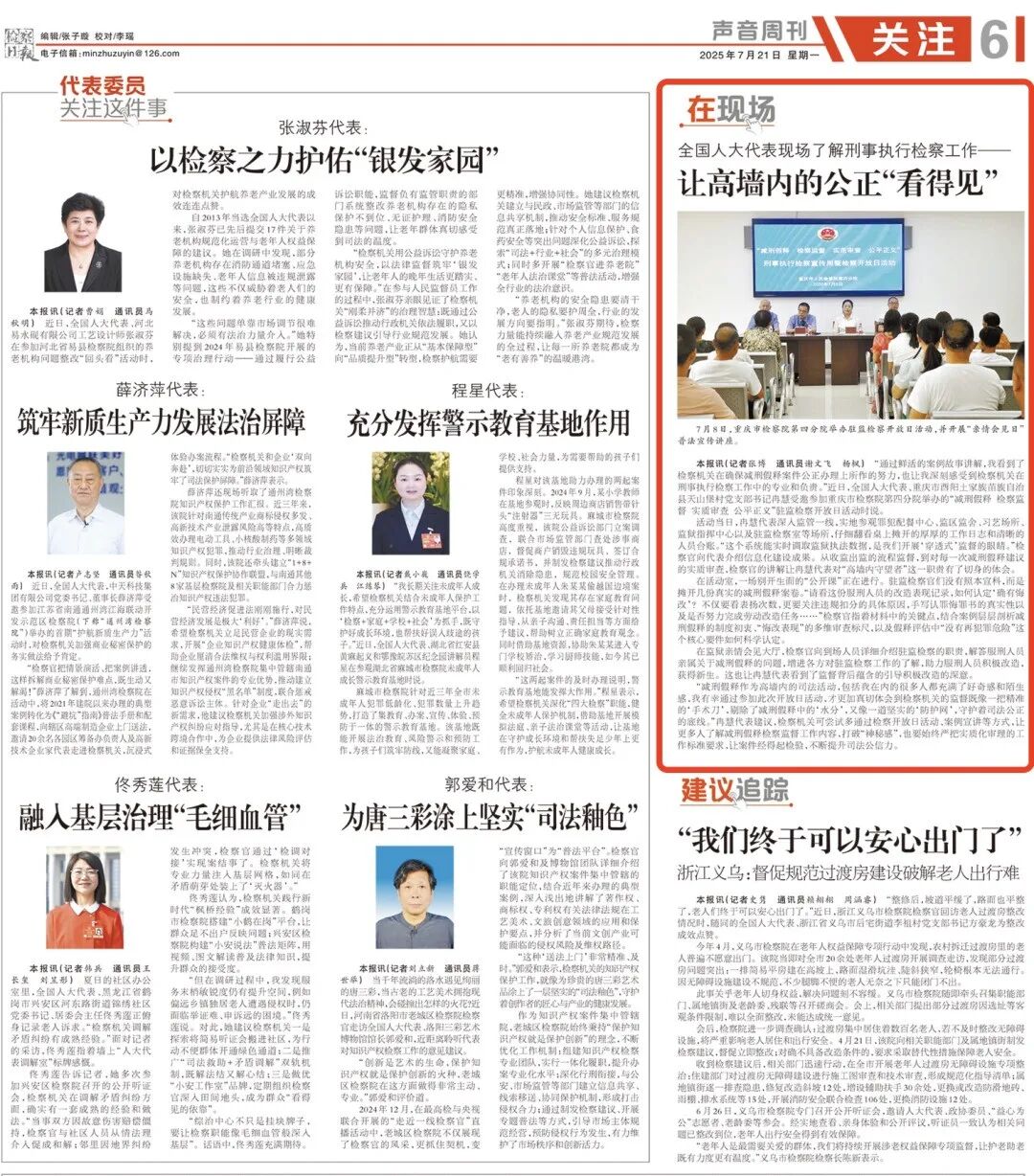 2025年7月21日,《检察日报》第6版刊登《全国人大代表现场了解刑事执行检察工作——让高墙内的公正“看得见”》一文,内容如下: