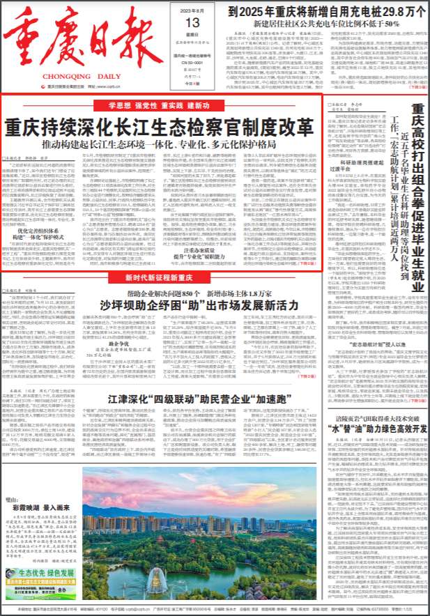 2023年8月13日,《重庆日报》头版头条“学思想 强党性 重实践 建新功”专栏刊登《重庆持续深化长江生态检察官制度改革:推动构建起长江生态环境一体化、专业化、多元化保护格局》一文,内容如下: