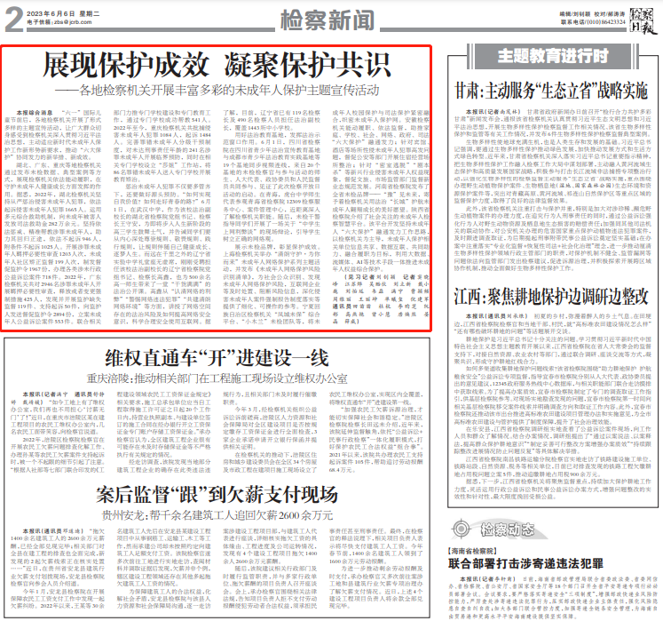 2023年6月6日,《检察日报》第2版刊登《展现保护成效 凝聚保护共识——各地检察机关开展丰富多彩的未成年人保护主题宣传活动》一文,内容如下: