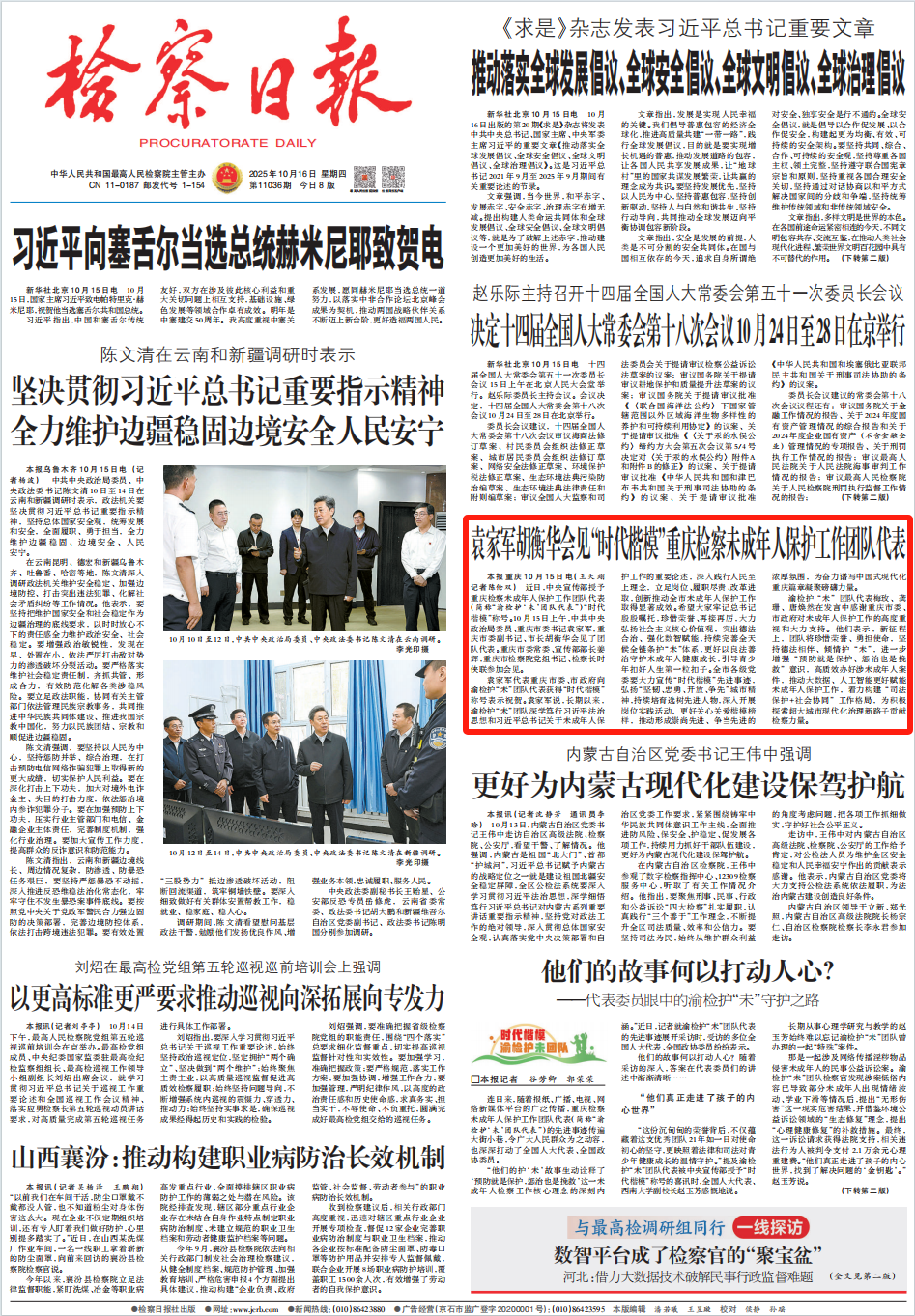 2025年10月16日,《检察日报》头版刊登《袁家军胡衡华会见“时代楷模”重庆检察未成年人保护工作团队代表》一文,内容如下: