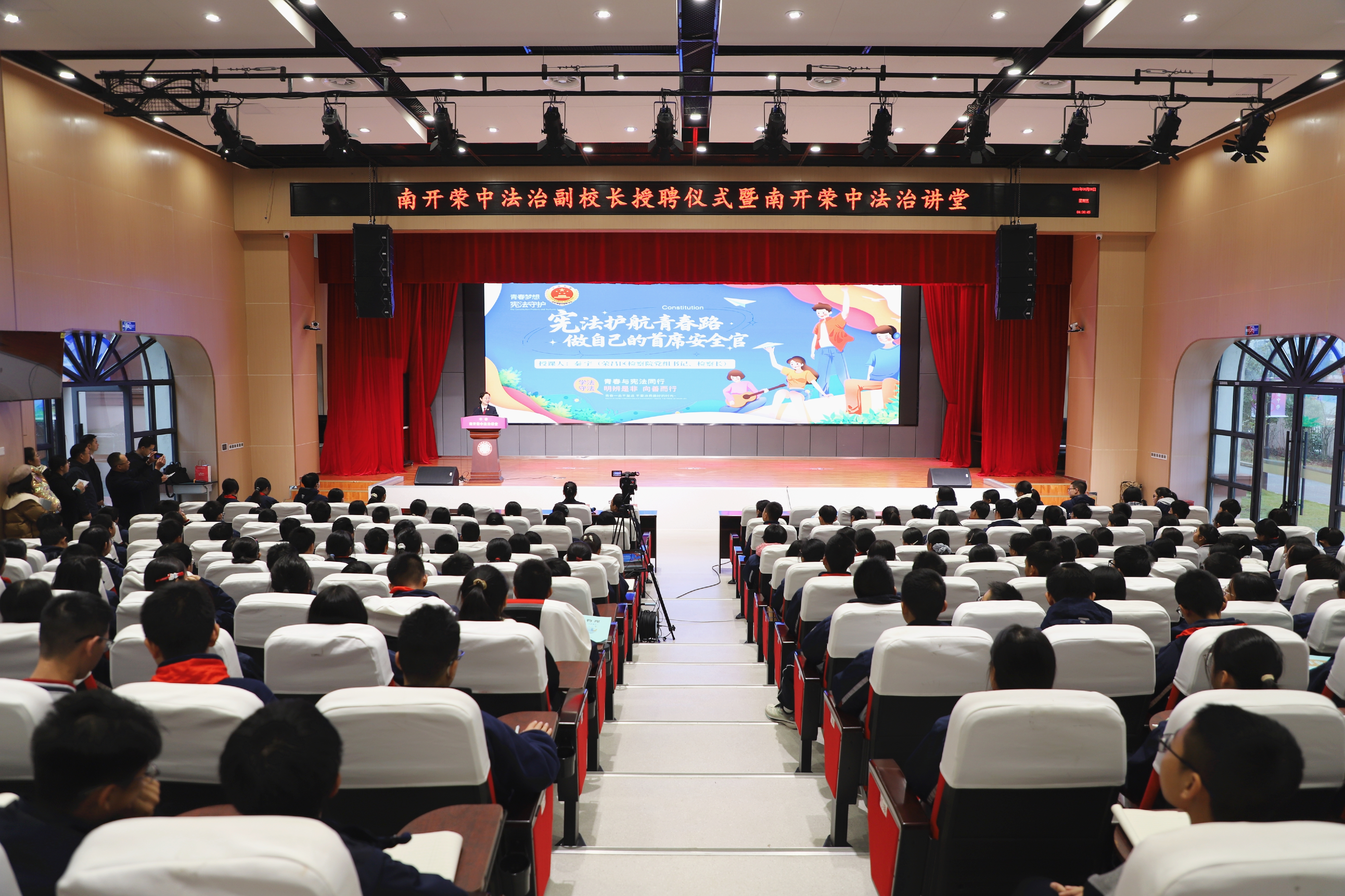 “宪法的地位和作用是什么?”“遇到校园欺凌该怎么办?”“如何保护自己的个人信息?”2025年12月4日,正值第十二个国家宪法日,南开荣昌中学校的报告厅里座无虚席。荣昌区检察院“莎姐”检察官走进校园,以“宪法护航青春路·做自己的首席安全官”为主题,为500余名师生带来了一堂生动又深刻的法治课。