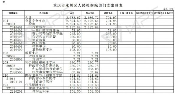 一、单位基本情况 重庆市永川区人民检察院是国家法律监督机关,内设17个职能部门。主要职能是:履行职务犯罪案件侦查、审查逮捕、审查起诉、审判活动监督、立案监督等。 二、部门预算情况说明 2017年一般公共预算财政拨款收入3388.67万元,一般公共预算财政拨款支出3388.67万元,比2016年增加541.27万元。其中:基本支出 2686.72万元,比2016年增加1162.82万元,主要原因是人员政策性增资和司法体制改革增资因素,主要用于保障在职人员工资福利及社会保险缴费、离退休人员离退休费及生活补助,保障部门正常运转的各项商品服务支出;项目支出701.95万元,比2016年减少621.55万元,主要原因是支出结构调整,主要用于查办和预防职务犯罪、公诉和审判监督、侦查监督、执行监督、控告申诉等重点工作。 2017年本单位无政府性基金收支。 三、 “三公”经费情况说明 2017年“三公”经费预算134.5万元,比2016年减少0.5万元。其中:因公出国(境)费用0万元,与上年持平;公务接待费33万元,与上年持平;公务用车运行维护费101.5万元,比2016年减少0.5万元, 减少主要原因是健全了公务用车制度,加强了日常细节管理。2016年,我单位认真贯彻落实中央关于厉行节约的各项要求,制定相关财务管理制度,严格控制“三公”经费开支。 四、其他重要事项的情况说明 1、部门运行经费情况。2017年一般公共预算财政拨款运行经费613.64万元,主要用于办公费、印刷费、邮电费、差旅费及其他商品和服务支出等。 2、政府采购情况。2017年政府采购预算总额50万元,其中:政府采购货物预算50万元。 3、绩效目标设置情况。2017年项目支出实行了绩效目标管理,涉及一般公共预算财政拨款701.95万元。