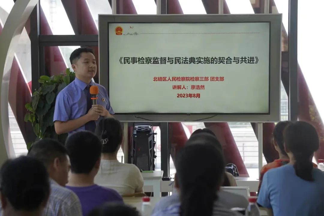 为进一步增强群众法治观念,引导广大群众学法、懂法、守法,8月16日,北碚区检察院检察三部干警廖浩然走进北碚区新时代文明实践中心,以《民事法律监督与民法典实施的契合与共进》为题,为前来听课的群众带去一堂贴近生活的《民法典》法治宣传课。
