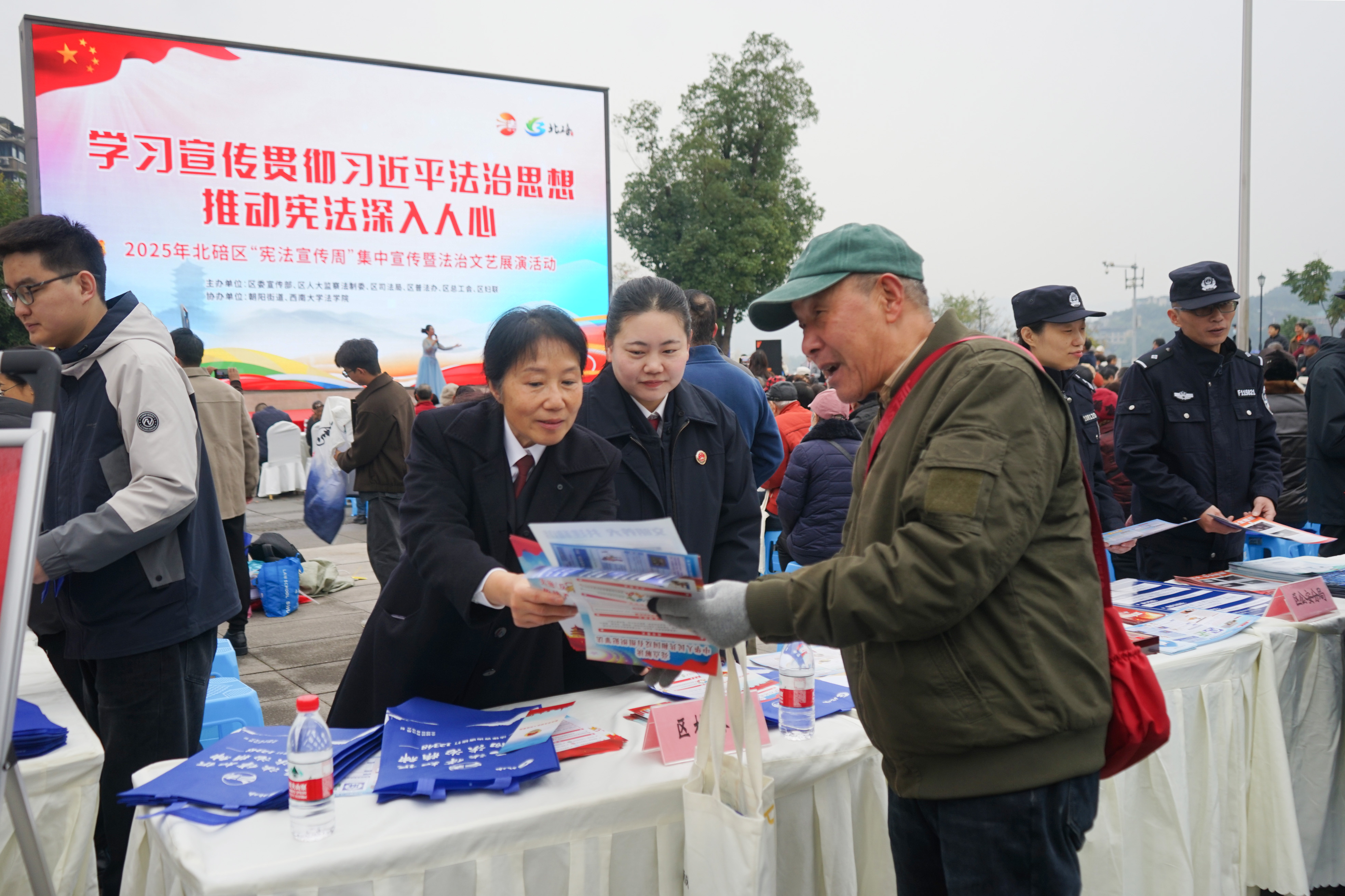 为展现检察机关以法治宣传践行宪法使命、推动法律普及落地的担当,12月4日,北碚区检察院联合多家单位开展的2025年“宪法宣传周”暨法治展演活动。在北碚区朝阳街道正码头广场,北碚区检察院干警通过向来往居民发放宣传资料的形式普及宪法知识,不仅用通俗易懂的“家乡话”解读宪法条文,还结合检察办案实践,围绕平安建设、扫黑除恶等热点问题以案释法,让宪法宣传走进更多场景、覆盖更多人群,推动法治精神深入人心。