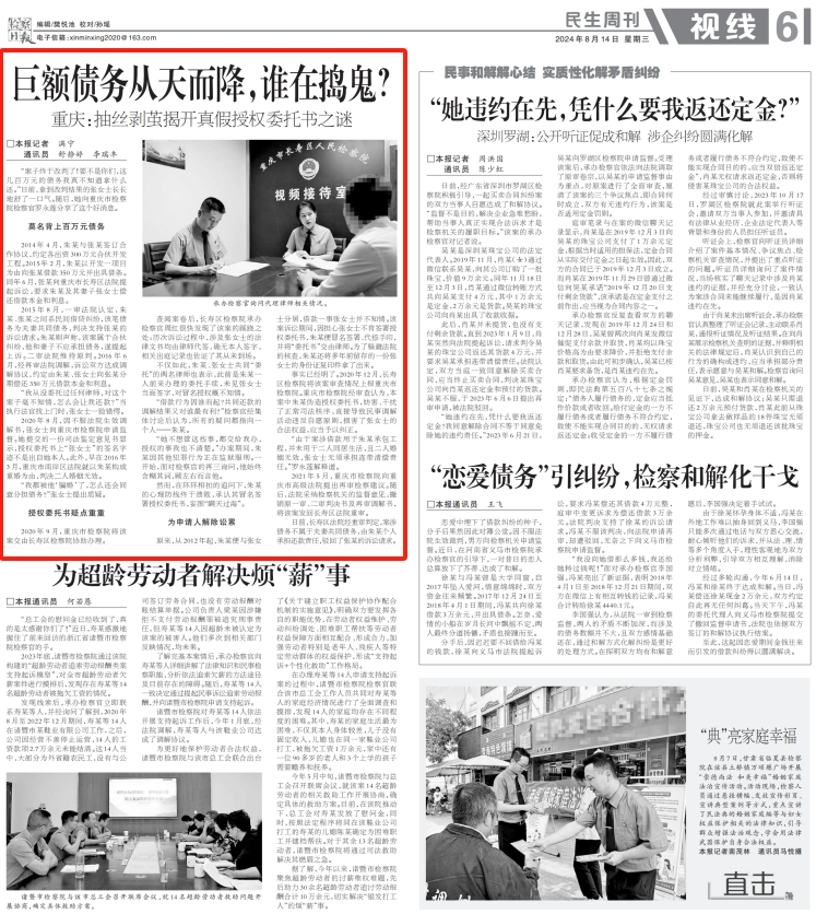 2024年8月14日,《检察日报》第6版刊登《巨额债务从天而降,谁在捣鬼?——重庆:抽丝剥茧揭开真假授权委托书之谜》一文,内容如下: