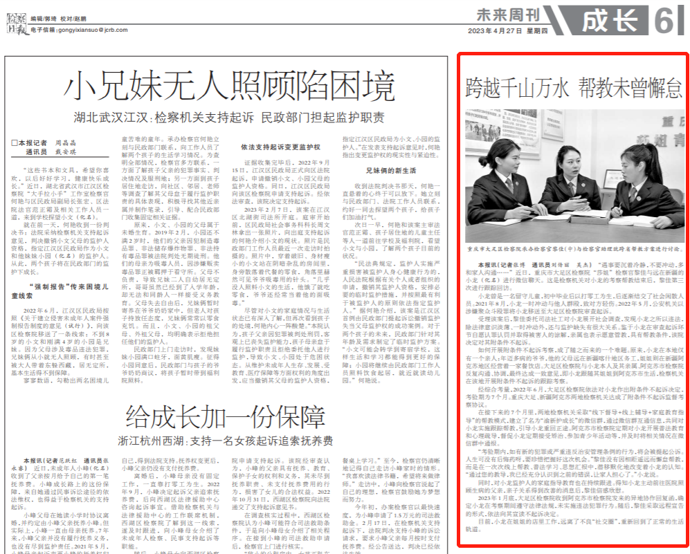 2023年4月27日,《检察日报》第6版刊登《跨越千山万水 帮教未曾懈怠》一文,内容如下: