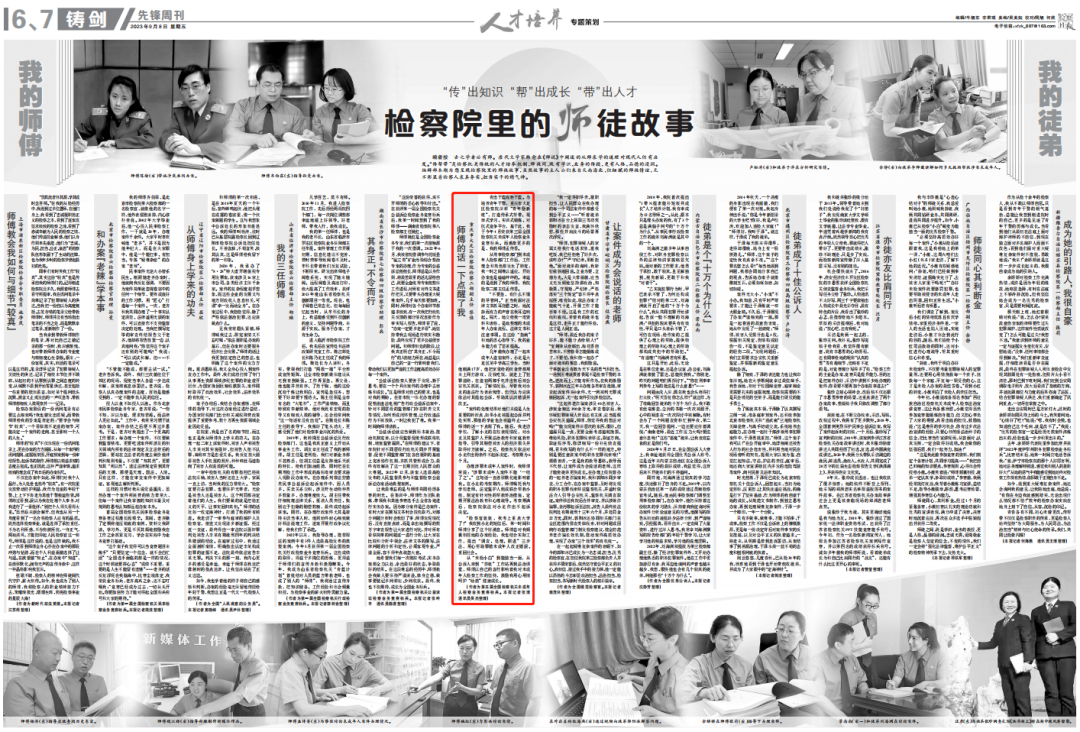 2023年9月8日,《检察日报》第6、7版通版“先锋周刊·铸剑·人才培养专题策划”刊登《黎佳:师傅的话一下点醒了我》一文,内容如下: