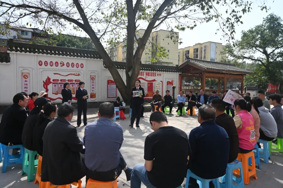 重庆市大足区文昌社区金灿灿的油菜花田旁,春日暖阳穿过百年黄葛树的枝丫,20余名中老年村民围坐在树根上,七嘴八舌地向检察官龙燕抛出“育孙”困惑。