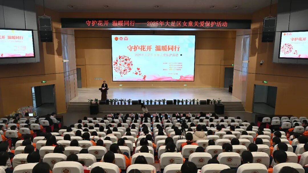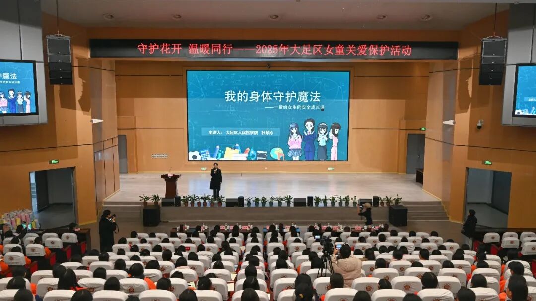 活动伊始,区妇联党组书记、主席刘文艳指出女童的健康成长关乎社会和谐与民族未来,保护未成年人是全社会共同的责任。她呼吁相关部门应进一步深化联动协作,各学校持续筑牢教育主阵地,家长切实履行监护责任,更多爱心人士加入“千手护蕾”队伍,共同织密织牢全方位、立体化的成长防护网。随后,现场播放宣传视频,重点推介大足区家庭教育指导服务专线——43768776。该专线汇聚资深专家,共有12名市、区级家庭教育指导师,聚焦亲子关系、情绪管理、心理健康等多元化服务内容,为广大家长提供个性化、专业化的精准指导,破解“不会管、管不好”的育儿困境。