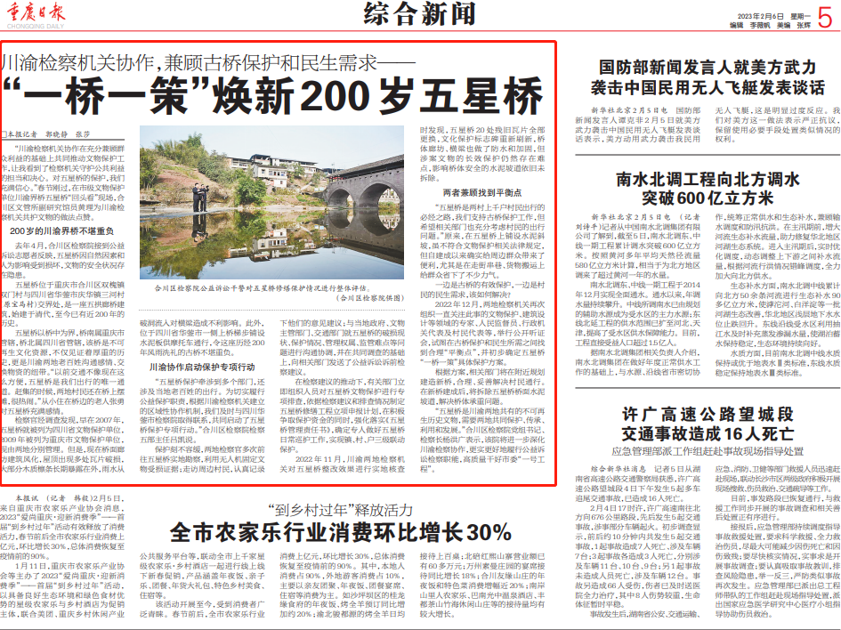 2023年2月6日,《重庆日报》第5版刊登《川渝检察机关协作,兼顾古桥保护和民生需求——“一桥一策”焕新200岁五星桥》一文,内容如下: