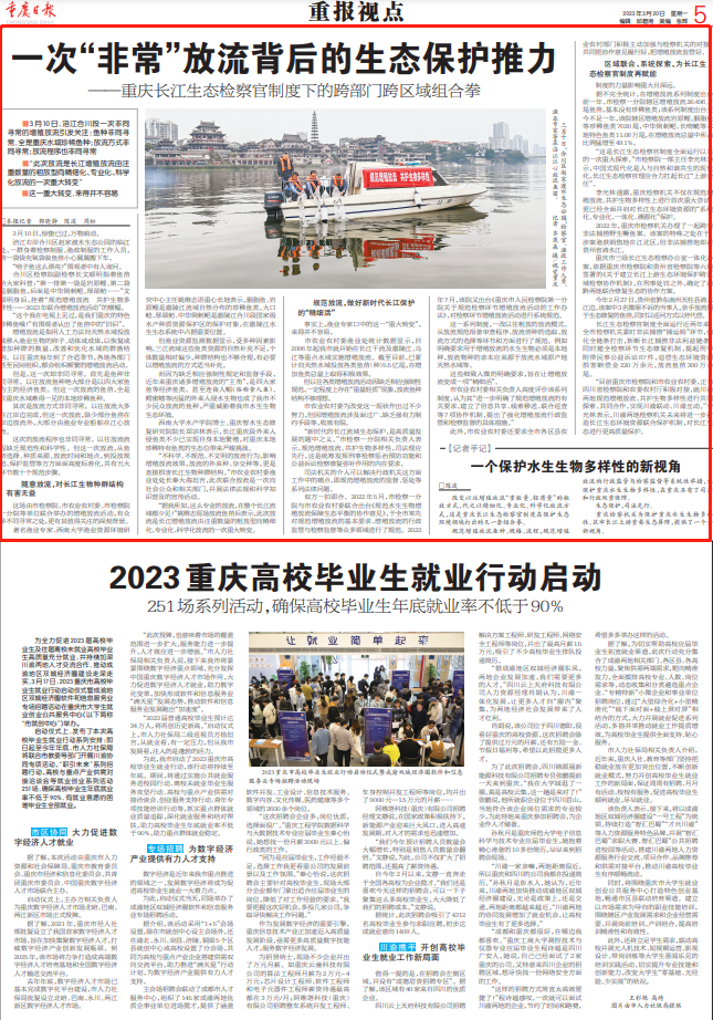 2023年3月20日,《重庆日报》第5版刊登《一次“非常”放流背后的生态保护推力——重庆长江生态检察官制度下的跨部门跨区域组合拳》一文,内容如下: