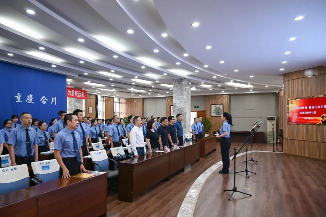 “起来!不愿做奴隶的人们!”随着激昂的旋律响起,合川区检察院全体干警肃立齐唱。嘹亮的歌声震彻全场,每个人眼中都饱含着对祖国的无限忠诚与热爱,将爱国情怀融入每一个音符。