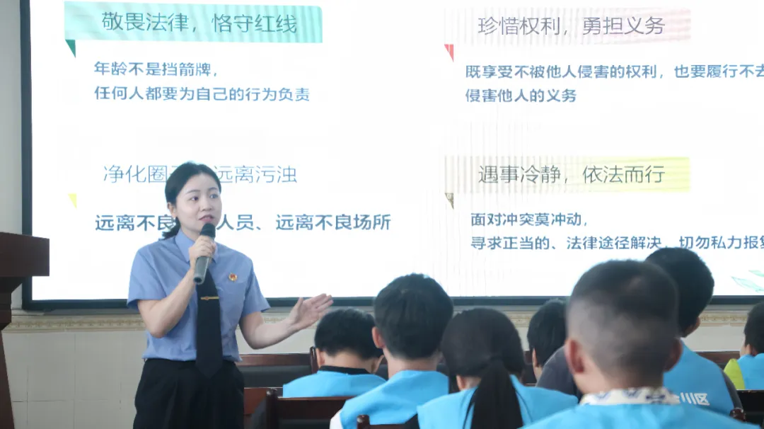 近日,在合川区临渡学校的一间教室内,“辨行为边界,走守法人生”的会标格外醒目。台下坐着30余名参加“一日体验班”的学生,讲台上,合川区检察院“小茂说法”普法志愿服务队成员、检察六部干警曾茂,正以一枚硬币作比,向同学们娓娓道来:“硬币有正反两面,正如我们每个人,都享有权利,也承担义务。”一场沉浸式法治课,由此拉开序幕。