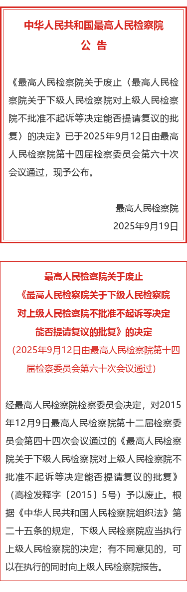 最高人民检察院关于废止《最高人民检察院关于下级人民检察院对上级人民检察院不批准不起诉等决定能否提请复议的批复》的决定
