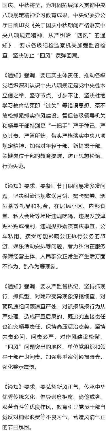 中央纪委办公厅印发《关于国庆中秋期间严格落实中央八项规定精神、从严纠治“四风”的通知》
