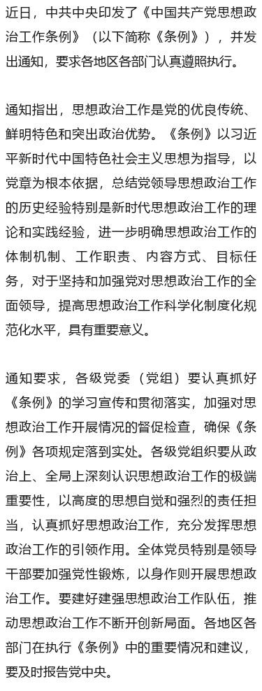 中共中央印发《中国共产党思想政治工作条例》